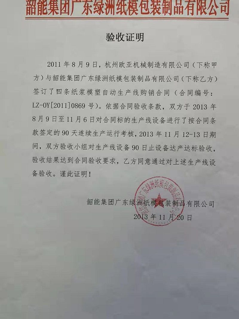 韶能集團廣東綠洲紙模包裝制品有限公司,是著名的紙漿模塑餐包生產(chǎn)企業(yè)。從2010年開始,綠洲公司前后分4期共購買浙江歐亞AE920型全自動紙漿模塑設(shè)備(植物纖維餐具)生產(chǎn)線72臺,全部達到產(chǎn)量和質(zhì)量標(biāo)準(zhǔn),并通過驗收。