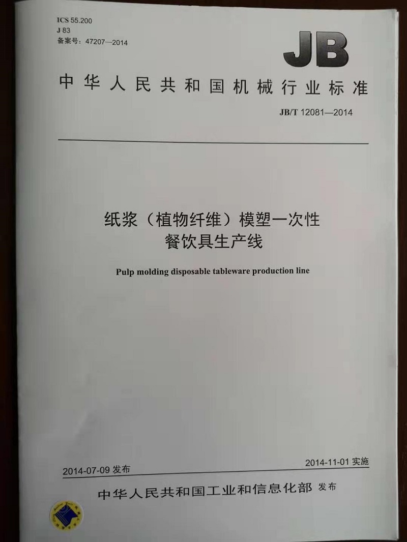 中華人民共和國行業(yè)標準:?紙漿(植物纖維)模塑一次性餐飲具生產(chǎn)線?2014-11-1實施。標準代號JB/T 12081-2014。本標準由鄭天波起草。是關(guān)于環(huán)保餐具設備生產(chǎn)線的紙漿模塑設備方面的第一個行業(yè)標準。