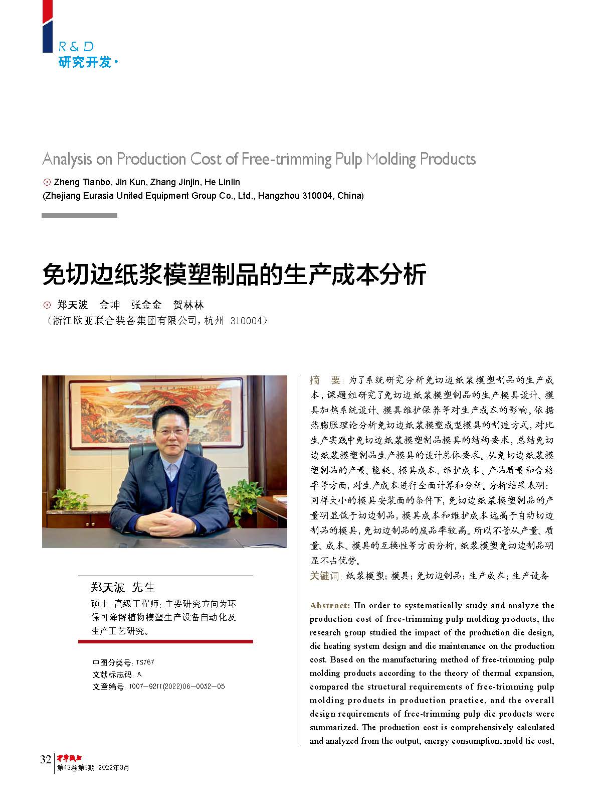 從免切邊紙漿模塑制品的產(chǎn)量、能耗、模具成本、維護(hù)成本、產(chǎn)品質(zhì)量和合格率等方面,對生產(chǎn)成本進(jìn)行全面計(jì)算和分析。分析結(jié)果表明:同樣大小的模具安裝面的條件下,免切邊紙漿模塑制品的產(chǎn)量明顯低于切邊制品,免切邊制品的模具成本和維護(hù)成本遠(yuǎn)遠(yuǎn)高于自動(dòng)切邊制品的模具。免切邊制品的廢品率較高。所以不管從產(chǎn)量、質(zhì)量、成本、模具的互換性等方方面面分析,紙漿模塑免切邊制品明顯不占優(yōu)勢,并存在初入行者所無法預(yù)知的重大生產(chǎn)問題。